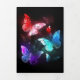 Drei helle, rote, lila, grüne, strukturierte Nachtschmetterlinge auf schwarz-leuchtendem Hintergrund.