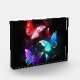 Drei helle, rote, lila, grüne, strukturierte Nachtschmetterlinge auf schwarz-leuchtendem Hintergrund.