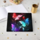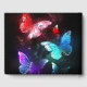 Drei helle, rote, lila, grüne, strukturierte Nachtschmetterlinge auf schwarz-leuchtendem Hintergrund.
