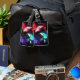 Drei helle, rote, lila, grüne, strukturierte Nachtschmetterlinge auf schwarz-leuchtendem Hintergrund.