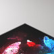 Drei helle, rote, lila, grüne, strukturierte Nachtschmetterlinge auf schwarz-leuchtendem Hintergrund.