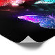 Drei helle, rote, lila, grüne, strukturierte Nachtschmetterlinge auf schwarz-leuchtendem Hintergrund.