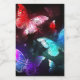 Drei helle, rote, lila, grüne, strukturierte Nachtschmetterlinge auf schwarz-leuchtendem Hintergrund.