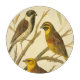 Der Künstler W. Rutledge hat die lebhaften Farben dieser Hausvögel perfekt eingefangen. Holen Sie sich dieses einfache, aber schön realistische Bild. Seitenansicht von zwei gelben Vögeln und einem dunkleren Vogel auf einem Zweig und Blick in verschiedene Richtungen.