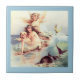 Drei junge Meerjungfrauen beobachten einen Delfin. Von einer antiken Postkarte. Pastellfarben und schöne alte Gemälde machen Frauen und Mädchen lustige Geschenke.