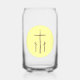 Bier oder Dosenglas zeigt drei rötlich-braune Kreuze, wie die auf Calvary, machen eine einfache Aussage. Sie zeigen in einem hellgelben Kreis mit Fraktalen. Große Christliche Hauswärmespende. Eine schöne Art, Ihren Glauben zu teilen.