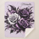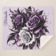 Diese Abbildung zeigt drei wunderschöne Rose, eine weiß und zwei lila, umgeben von eleganten schwarzen und lila Dekorationen. Dunkle Töne und komplexe Details schaffen eine geheimnisvolle und gotische Atmosphäre, während hellere Teile Kontrast und Tiefe verleihen. Um eine Touch der Personalisierung zu erhalten, erwägen Sie, der Decke einen Namen oder ein Monogramm hinzuzufügen.