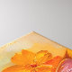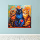 Die Katzen sind von blühenden Blumen umgeben – orange und rosa Blüten, die die Wärme ihrer Fellfarben widerspiegeln und dem Bild eine verspielte Note verleihen. Der Hintergrund besteht aus einem sanften Farbverlauf aus Blau, Grün und Gelb, gemalt mit ausdrucksstarken Pinselstrichen, die eine träumerische Atmosphäre schaffen. Das Licht ist warm und ausgewogen und verleiht den Katzen und Blumen einen sanften Glanz.
