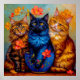 Die Katzen sind von blühenden Blumen umgeben – orange und rosa Blüten, die die Wärme ihrer Fellfarben widerspiegeln und dem Bild eine verspielte Note verleihen. Der Hintergrund besteht aus einem sanften Farbverlauf aus Blau, Grün und Gelb, gemalt mit ausdrucksstarken Pinselstrichen, die eine träumerische Atmosphäre schaffen. Das Licht ist warm und ausgewogen und verleiht den Katzen und Blumen einen sanften Glanz.
