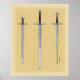 Ein Schwert aus der Normandie mit einem brasilianischen Nussbaum, ein langblattes "Großes Schwert" oder "Kriegsschwert" aus dem 13. oder 14. Jahrhundert und ein scharf spitzes, turbulentes Schwert aus dem Späten Mittelalter erscheinen in dieser originalen Illustration von Richard H. Fay nebeneinander.