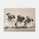 Drei Möpsen legen Seite an Seite und neigen alle ihre Köpfe auf die gleiche Weise.