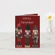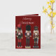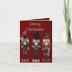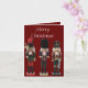 Diese Weihnachtskarte enthält drei bunte, traditionelle, hölzerne Weihnachtsernährungssoldaten, eine mit Axt, eine mit Zybalen und eine mit Schwert. Der Hintergrund ist dunkelrot, mit bearbeitbarem Text, sodass er wirklich persönlich gemacht werden kann.