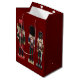 Diese Geschenktasche enthält drei bunte, traditionelle, hölzerne Weihnachtsernährungssoldaten, eine mit einer Axt, eine mit Zybalen und eine mit einem Schwert. Der Hintergrund ist dunkelrot. Lieblich mit Geschenken und Leckereien füllen.