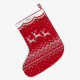Drei weiße Rentiere springen über die Oberfläche dieses niedlichen Weihnachtsliedes. Die Rentiere sind Teil eines Imitats Strick nordischen Design, das auf einem roten Hintergrund platziert wird. Eine weiße, in Rot umrandete Kante hält Ihren individuellen Namen oben grau. Die Rückseite des Strumpfs ist identisch mit der Vorderseite. *Bitte beachten Sie - das Strick-Aussehen dieses Designs wird simuliert, um so auszusehen, als wäre es gestrickt.