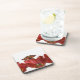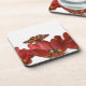 Drei rote Tulpen und ein Monarchfalter gegen Getränkeuntersetzer