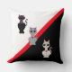 Drei schöne Katzen und ein diagonal roter Streifen auf schwarz-weißem Hintergrund. Katzen sind in schwarz, grau und weiß. Ideal für Katzenliebhaber.