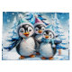 Drei bezaubernde Pinguine stehen in festlichen Winterhüten und farbenfrohen Schals. Ihre großen, runden Augen strahlen vor Freude, während ihre flauschigen weißen Bäuche mit dem hellblauen Weihnachtsbaum kontrastieren, der mit funkelnden Lichtern geschmückt ist. Die Pinguine lächeln glücklich und scheinen bereit, den Zauber der Feriensaison zu feiern. Rund um sie tanzen zarte Schneeflocken durch die Luft, während funkelnde Sterne am Himmel leuchten und eine warme, festliche Atmosphäre schaffen. Dieses Design vereint den Geist der Weihnachten - voller Freude, Freundschaft und Winterwundern!