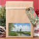 Rechteckiger Aufkleber aus drei Windmühlen entlang eines Kanals mit Booten und Schilfröten unter einem blauen Himmel mit puffigen Wolken, die eine friedliche Szene in der niederländischen Landschaft von Leidschendam schaffen.