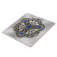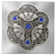 Quadratische Keramikfliese eines silbernen Medaillons mit einem funkelnden blauen Saphir in der Mitte und drei umgebenden blauen Saphiren auf glänzendem Silber.