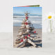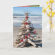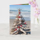 Weihnachtsbaum aus Treibholz mit Muscheln und Seestern an einem Meeresstrand. Der Text ist bearbeitbar.