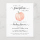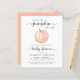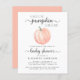 Eine niedliche, fröhliche und preisgünstige, geschlechtsneutrale Anreise mit der Babydusche mit der Einladung "A Sweet Little Pumpkin Is On its Way", die in einer Mischung aus sanfter, moderner Typografie und stilvollem Schriftsatz sowie einer pastellorangefarbenen Wasserfarbe eines Kürbis geschrieben wurde. Sie können den Namen der Mutter personalisieren und Details in schlichter grauer Typografie duschen.
