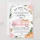 Herrliche Vegetation und blumenreiche Kürbiseinladung mit einem rosa LKW gefüllt mit Kürbissen.