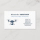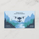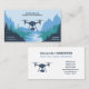 Eine Visitenkarte für Aktivitäten mit Drohnen, Luftaufnahmen, Drohnenpiloten, Agrardrohne, Drohnenverleih, etc. Es wird begleitet von einer Illustration einer Drohne, die über eine malerische Landschaft fliegt. Die Drohne ist mit einer Kamera ausgestattet, die die Landschaft erfasst. Die Landschaft umfasst Berge, Bäume und einen Gewässer. Auf der Rückseite finden wir die vollständigen Koordinaten und eine Abbildung der Drohne.