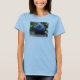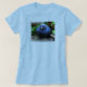 Ein mürrischer schauender blauer Vogel auf dem blauen T-Shirt der Frauen. Titel: Sehe ich wie die Drossel des Glückes aus?