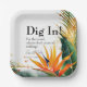 Das Rundpapier "Birds of Paradise Bliss Round Paper Plate" mit einer faszinierenden, dunkelgrünen Kulisse und einem reizvollen Rahmen, der die exotische Schönheit der Paradiesvögel aus der Sammlung "Birds of Paradise Bliss" zeigt. Diese Platte trägt eine Touch Spaß mit dem Titel: "Dig in! Für den Rekord zählen Kalorien bei Hochzeiten nicht!" Unterhalb der Unterschrift werden die Namen der Paare spielerisch präsentiert, begleitet vom Datum der Zeremonie. Dieses lichtdurchflutete und visuell atemberaubende Design fügt der Papierplatte eine einzigartige und unterhaltsame Touch hinzu und macht sie nicht nur zu einem funktionalen Element, sondern auch zu einem charmanten und amüsanten Accessoire, das der Sammlung "Birds of Paradise Bliss" Freude bereitet.