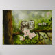 Ölgemälde Kinderhühner. Print zum Verkauf. Rosa Blume Eulen im Baum.