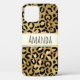 Eine Telefonzelle mit einem stilvollen Muster. Exotische schwarze Leoparden auf einem goldenen Hintergrund. Wilder und dennoch eleganter Stil. Ein cremefarbener Rechteckrahmen mit einer goldenen Folie in Imitaten, die oben mit dem personalisierten Text überlagert ist.
