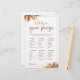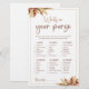 Genießen Sie Ihr Brautparty oder Ihren Junggeselinnen-Abschied mit dieser anpassbaren Spielkarte! Wasserfarbenes tropisches Bouquet mit trockenen Pampas. WIE MAN SPIELT - Geben Sie jedem Gast eine Kopie einer Liste alltäglicher Gegenstände, die Frauen in ihren Geldbörsen tragen können, wie Lippenstift, Telefon oder Spiegel, und fügen Sie einige ungewöhnliche Dinge hinzu, um das Spiel interessanter zu machen. - Jedes Element sollte einen Punktwert haben. - Jeder Gast sollte seine Geldbörsen durchsuchen und seine Punkte aufzählen. - Der Spieler mit der höchsten Punktzahl gewinnt einen Preis.