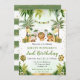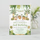 Aquarellfarbener Niedlicher Affe, Tiger, Zebra, Hippo und Löwe-Design mit grünen tropischen Dschungelwüsten-Blätter, Goldrahmen und Goldfass-Glitzer Confetti mit grünem Streifen Hintergrund