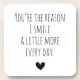 Niedlicher und trendiger Typografie-Untersetzer mit den Worten "Du bist der Grund, warum ich jeden Tag etwas mehr lächle" in einem schwarzen Text auf weißem Hintergrund und einem kleinen schwarzen Herz darunter.