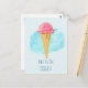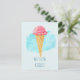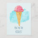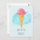 Eine leckere Postkarte mit einer leckeren Abbildung der Eistüte mit einer Bruchkerbe aus rosa Erdbeereis, die von einem Waffelkegel gehalten wird. Set auf einem Aqua Blue Aqua Aquarell Farbe Spritzer / Pinselstrich. Im Text steht: "Du bist die coolstste".