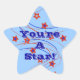 "You're A Star!" in grob blau fett formatiertem Text, oder leicht ändern Sie den Text zu anpassen. Großartige Prämienticker für Lehrer und Eltern, oder zur Werbung für Ihr Unternehmen, oder einfach nur den Text für Aufkleber, Umschlag Aufkleber und Gastgeschenke verlassen, mit einem großartigen Hintergrund illustriert Design von coolen roten, weißen und blauen Schießstars von Feuerwerken~nice für den 4. Juli, oder jede patriotische Feier. Der perfekte und beliebte sternförmige Aufkleber wird gezeigt.