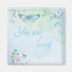 Pastellblaue Aquarellfarben mit einem blauen Schmetterling in Single, einem Blumenrand und einer Blume in Single Rosa mit dem individuellen Satz "You are love" in großen blauen Buchstaben.