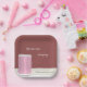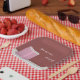 Abbildung eines Löffels aus rosa Faden mit Nähnadel.