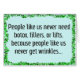 Diese lustige Karte ist unsere Antwort auf diese junge, besessene Gesellschaft, in der wir leben. Es sagt: "Menschen wie wir brauchen nie Botox, Füller oder Aufzüge, weil Menschen wie wir nie Falten bekommen." Im Inneren steht: "Wir bekommen "F*ck you" Zeilen." Schicken Sie diese lustige Karte an jeden, den Sie kennen, der sich über den Alterungsprozess lustig macht oder mit dem Versuch gefüttert wird, ewig 22 mit der Figur eines vorpubeszierenden Jungen bleibe. Übrigens, dies ist die aufgeräumte Version mit dem Sternchen, das einen Buchstaben ersetzt. Wenn du will, die andere Version zu sehen, musst du mit einem PG-13 Account bei Zazzle angemeldet sein.