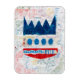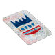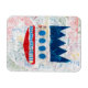 Frische geometrische Formen dominieren die Komposition, mit einer prominenten blauen kronenartigen Form über einer Serie von vier blauen Ovalen. Eine rote, zigzackige Form verleiht dem texturierten weißen Hintergrund eine lebendige Note.