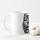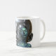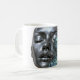 A small green metallic female android in front of a large chrome android face with closed eyes, printed on a white mug.