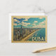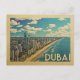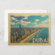 Dubai Design im Vintage Travel Stil mit einer Szene an der Küste mit dem Strand und Skyline von Dubai.