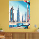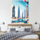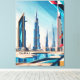 Eine moderne künstlerische Leinwand, die die atemberaubende Skyline Dubais einfängt. Schmale Wolkenkratzer erheben sich über dem ruhigen Ufer und verbinden futuristische Architektur mit elegantem Design. Ideal, um jedem Zimmer eine Touch urbaner Eleganz hinzuzufügen.