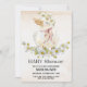 Babydusche Party Einladung mit niedlicher Duck und weißem Chrysanthemum Kranz auf ihrem Kopf.