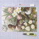 Entenpaare am Wasser, umgeben von weißen und violetten Blumen, mit französischem Poststempel im Hintergrund. Ideal für Entkoppelung.