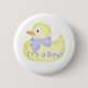 Eine gelbe Ente mit einem blauen Band und einem blauen Text, der "es liest, ist ein Junge!" auf Babyknöpfen, -magneten und -mehr.