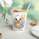 Ein zauberhaftes, belebtes Entlein in gelbem Gewand sitzt glücklich inmitten einer lebhaften Palette von bunten Ballons. Das Entlein hält einen gelben Ballon in einer Hand und hat breite, fröhliche blau-schwarze Augen, die Freude ausstrahlen. Der Hintergrund zeichnet sich durch einen hellblauen Verlauf mit zusätzlichen schwimmenden Ballons aus, was die festliche Atmosphäre noch verstärkt. Ein charmantes Banner am unteren Bildrand zeigt die Worte "BABY SHOWER", was es perfekt für feierliche Anlässe macht.