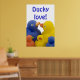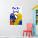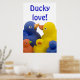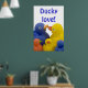 Zwei Gummienten in der Liebe. Ein niedliches Poster mit blauen und gelben Entenküssen. Drei kleine Enten mit ihrem Papa und Mama feiern ihre glückliche Familie oder vielleicht ein neues Baby. Niedliches Poster, das Sie mit Ihrer eigenen Textnachricht anpassen können. Ideal für diejenigen, die Sie Liebe, um Ihr Jubiläum, Schwangerschaft oder neue Baby oder Babys zu feiern.