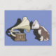 Ein Hund mit Kratzkegel, der an einem antiken Grammophon-Schallplattenspieler mit Messingtrichter heult. Farbe, Schatten für schönen, 3-D-Effekt, auf T - Shirt, Poster, Karten, Geschenke.
