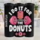 Diese lustige und spielerische Grafik zeigt einen Grill mit rosa Donuts als Gewichte und den Text "I DO IT FOR THE DONUTS". Das Design hat ein etwas bedrücktes, skurriles Aussehen, das einen humorvollen Ausspruch für jeden schafft, der für die Liebe von Essen arbeitet.